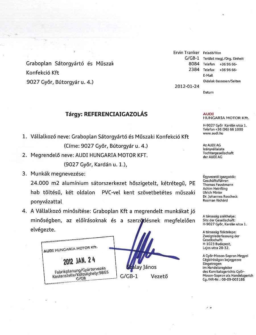 Audi – logisztikai raktársátrak tervezése, kivitelezése és helyszíni szerelése. Cégünk, a GRABOPLAN Sátorgyártó és Műszaki Konfekció Kft. feladata volt az Audi Motor Hungary Kft. részére a kiírt pályázatok alapján logisztikai raktársátrak létesítése. A pályázat szigetelt és szigeteletlen raktárcsarnokok gyártására íródott.