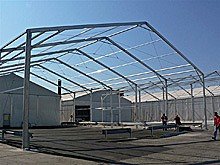 A sátoregyüttest 20 m fesztávú, alumínium keretváz rendszerű sátorszerkezet alkotja, melynek keretlábai a standardhoz képest – a 6 m-es vállmagasságra való tekintettel- egyrészt erősítettek, másrészt pedig össze is kapcsoltak.